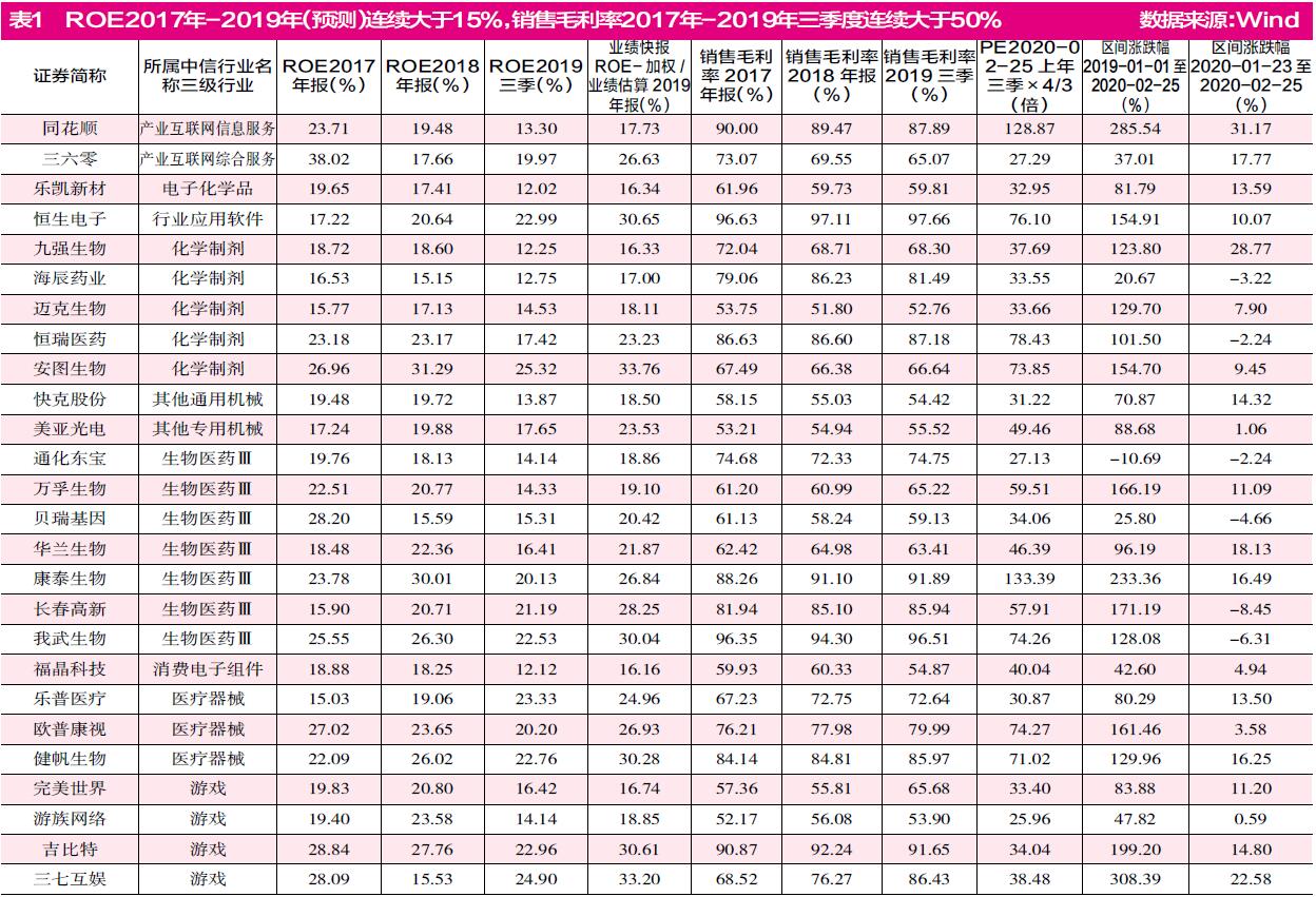 在毛利率连续三年高于50%,同时ROE连续三年高于15%的企业中,同花顺、东方财富等公司纷纷出现。仅就同花顺来说,固本资产首席投资官雷本仲在接受采访时表示,A股慢牛行情整体利好同花顺。他认为,从稳定的业务构成和向上的市场行情来看,同花顺ROE水平应该不会有太大波动。他预计同花顺2019年ROE增速与以前年度保持接近,即在20%左右。
