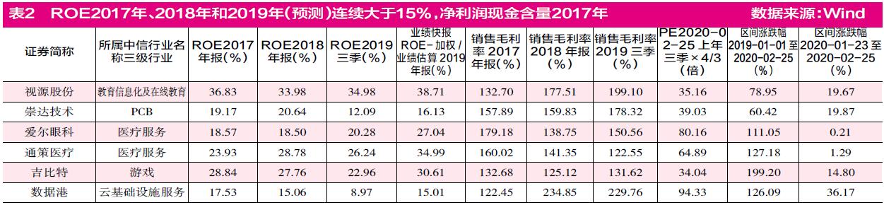 本周,《证券市场周刊》作者通过五项与业绩相关的指标综合筛选科技股。本刊使用的筛选指标包括上市公司2017年、2018年和2019年连续三年ROE≥15%(对没有发布2019年业绩快报的公司以其2019年三季报ROE为基础测算得出,下同),同时还纳入了毛利率连续3年超过50%、净利润现金含量在过去三年均超过120%、资产周转率连续3年提高以及自由现金/营业收入连续3年提高,另外对周期股和次新股做了剔除。这些指标分别代表着企业的不同业绩方面,如毛利率代表了企业的盈利难易程度,净利润现金含量代表了企业销售回款能力,资产周转率显示企业的经营效率,自由现金/营业收入能够显示出企业是处在扩张还是起步或萎缩阶段。另外,《证券市场周刊》还考虑了上市公司业绩快报情况等。
