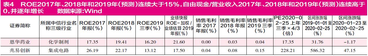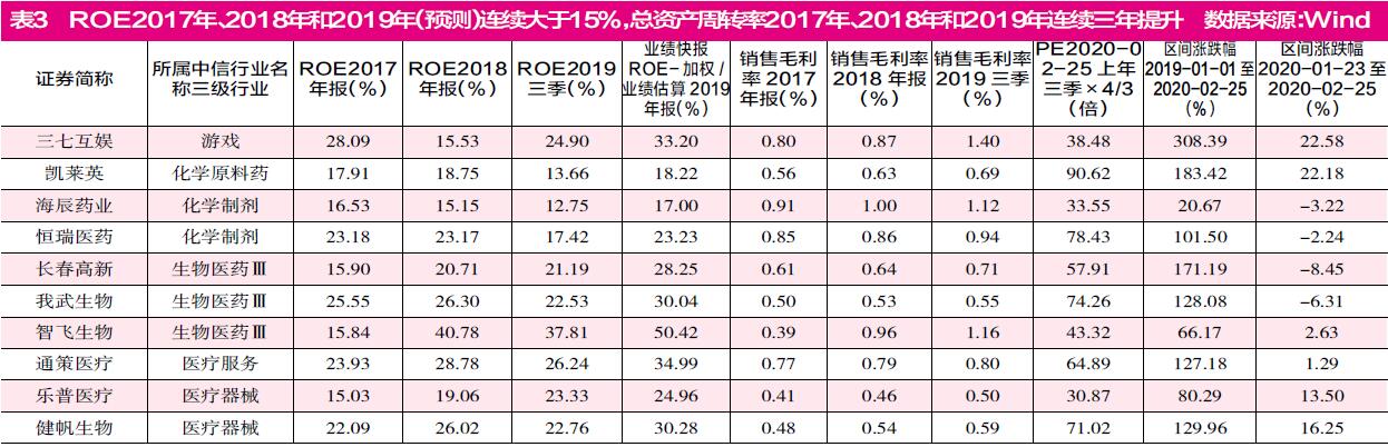 据《证券市场周刊》统计,ROE连续3年高于15%同时资产周转率2017年、2018年和2019年连续提高的企业合计有10家,包括三七互娱、凯莱英、海辰药业、恒瑞医药、长春高新、我武生物、智飞生物、通策医疗、乐普医疗和健帆生物,这其中有9家是医药企业。而ROE连续3年高于15%同时毛利率连续3年高于50%的企业有26家,其中有15家是医药企业。总体来看,医药企业数量占比过半,且显示出突出的高效率和高毛利情形。