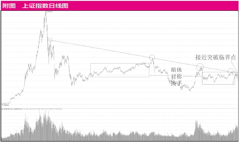 从上证指数的角度看,目前正处于转向牛市的关键点。经过最近一年在2800-3200点核心区间的箱体震荡,上证指数对称消化2016-2018年的套牢筹码效果良好。虽然这次箱体整理的时间较短,但期间多次放量已经超过此前套牢区的累计换手,显示新资金已经逐步实现对旧筹码的置换,这也是历史上牛市所需要的条件之一。目前,上证指数仍然受制于2015年以来的下降趋势线,但随着时间的推移,突破的时机已经越来越成熟,投资者可密切关注此线的得失。一旦有效站上,上证指数将确认牛市格局(见附图)。