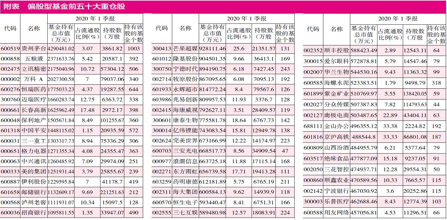 除仓位外,板块上增仓最为突出的是因疫情导火索提升市场关注度的医药板块,年初至4月23日,申万医药生物指数上涨了19.6%,跑赢大盘26个百分点。天相投顾数据显示,首季恒瑞医药、迈瑞医疗和长春高新携手杀入重仓股前十,对比上一个季度,三家医药板块中细分行业的龙头均向前大踏步提升了排名。此外,康泰生物、药明康德、华兰生物、爱尔眼科、乐普医疗等标的股也成功杀入本季基金重仓股前五十位。