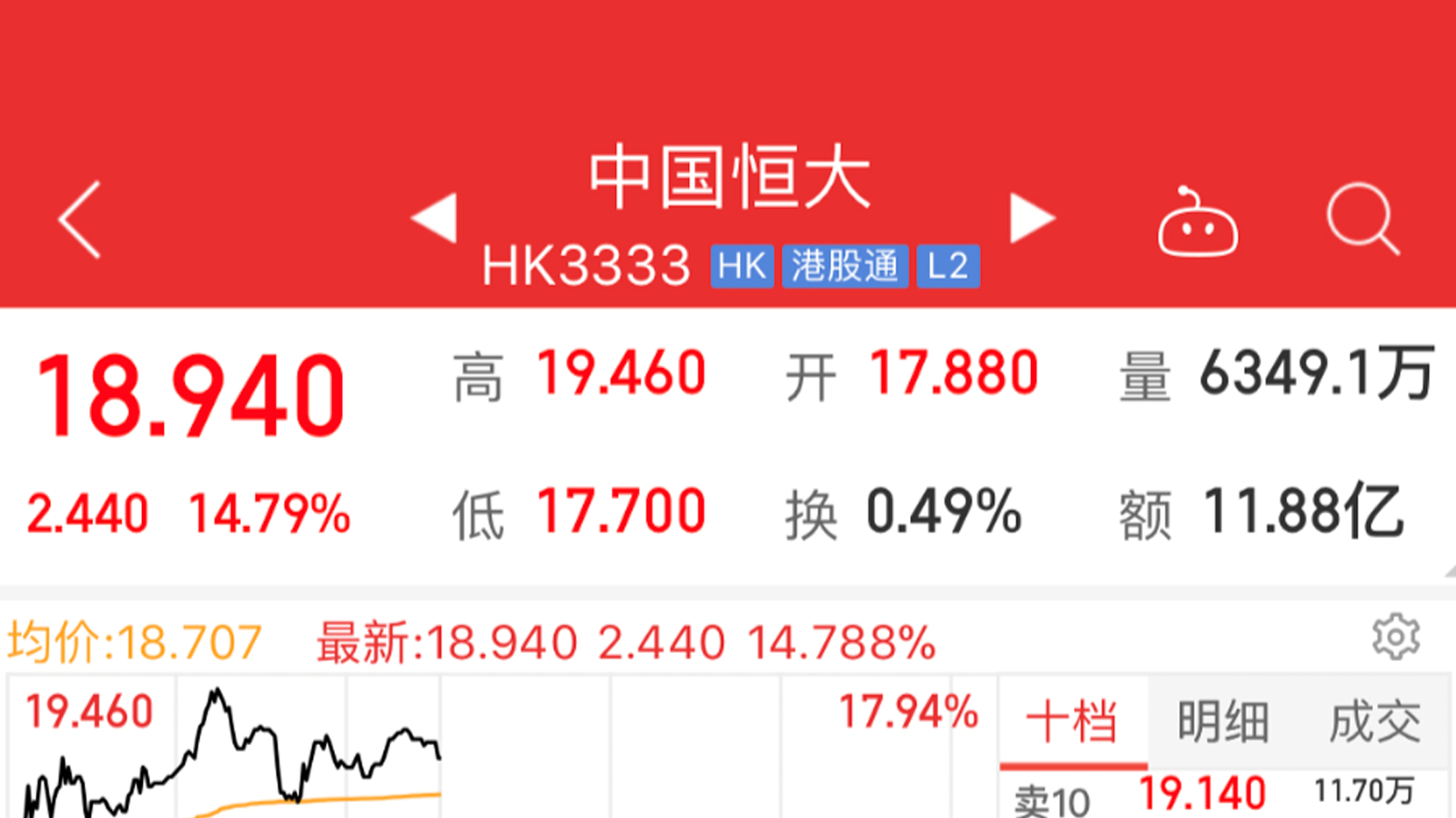 随着此番补充协议的签订,9月30日恒大股票再次走高,截至中午收盘,中国恒大(3333.HK)大涨14.8%至18.94港元。