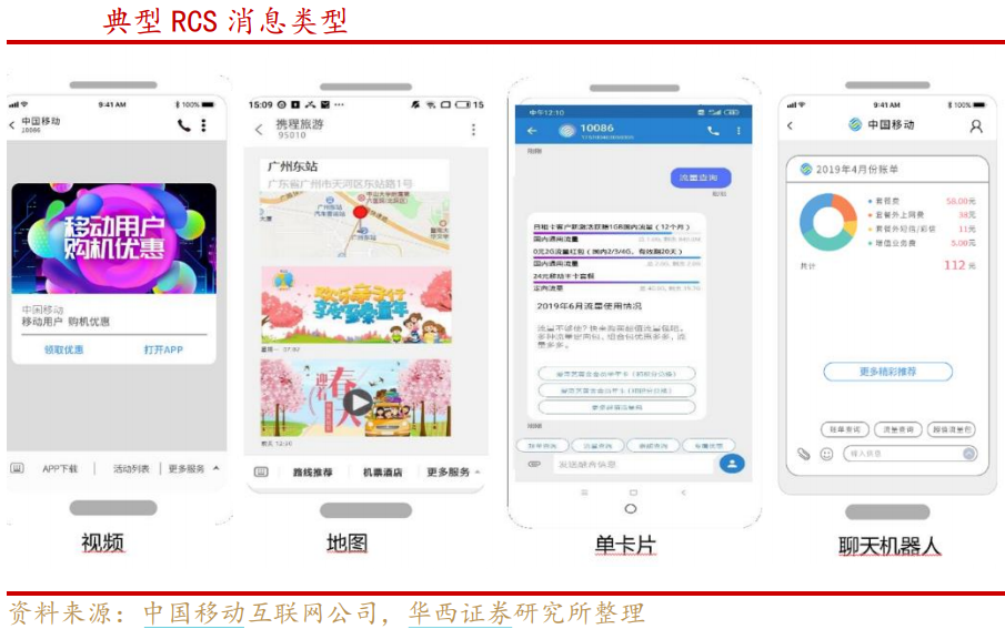 安信证券认为,由于RCS在短信接口中集成了各种功能接口,伴随5G的高速率低延时特性,使得通过手机短信实现原本需要用APP才能做到的事情。传统APP需要下载、占用手机存储空间,在某种程度上,RCS即发即用的优势具备取代大部分轻型APP的能力,使得短信平台跃升为应用分发的战略入口。因此,RCS能够覆盖聊天客服、在线购物、短视频营销、精准交互等广阔的市场。