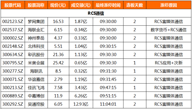 RCS作最新的主题概念,连续两个交易日大幅上涨,梦网集团、神州泰岳、吴通控股、彩讯股份、中嘉博创等多家公司两连板。