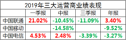 例如,A股上市公司中国联通,2019年年报扣非增速勉强维持正增长(3.4%)。港股上市公司中国移动和中国电信,2019年业绩增长情况同样难言乐观。2019年年报数据显示,中国移动2019年扣非净利润同比下降9.52%,中国电信2019年扣非净利润同比下降3.27%。