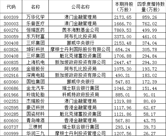 另外,澳门金管局四季度增仓万华化学、乐普医疗;奥本海默增持恒瑞医药等。