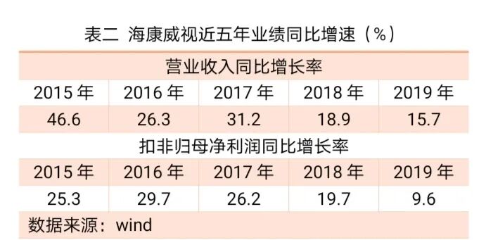 《证券市场周刊》作者梳理海康威视近五年业绩增速(见表2)注意到,公司营收增速从2015年的46.6%下滑至2019年15.7%,扣非归母净利润增速也从25.3%下滑至9.6%。