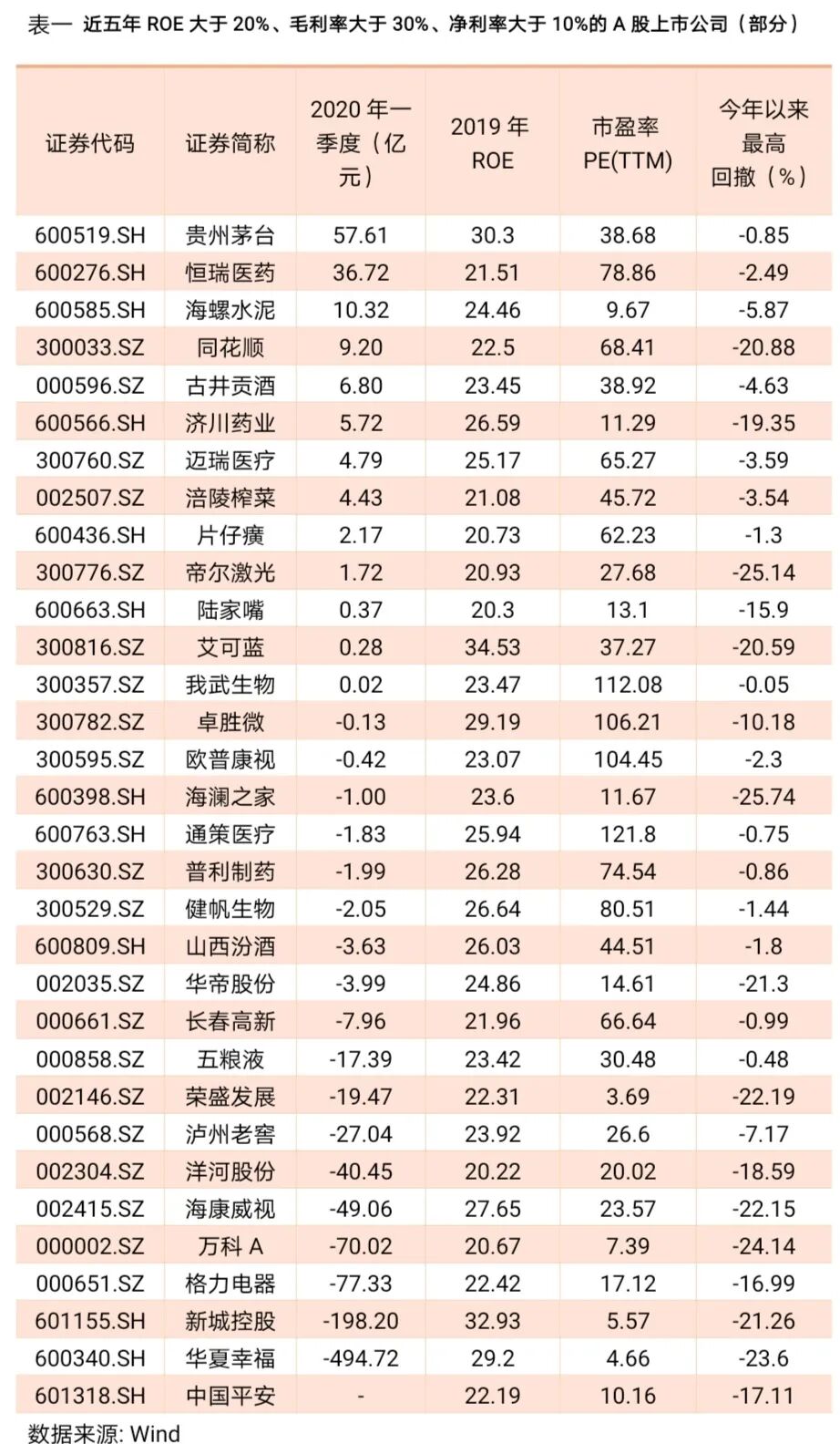 《证券市场周刊》梳理近五年ROE(净资产收益率)大于20%、毛利率大于30%、净利率大于10%的55家上市公司相关数据(见表1)发现,其中有41家公司2019年FCFF(自由现金流)为正,但至今年一季度自由现金流为正的公司只有17家,其中贵州茅台、恒瑞医药、海螺水泥、迈瑞医疗、涪陵榨菜、片仔癀、我武生物为正,五粮液、海康威视、万科A、新城控股等热点公司则均为负。