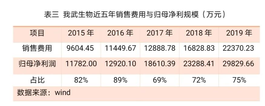 我武生物2019年业绩报告显示,公司报告期内实现营业收入6.39亿元,同比增长27.68%;归母净利润2.98亿元,同比增长28.09。随着销售人员数量的增加以及销售市场的不断拓展,公司市场推广费、职工薪酬有所增加,全年销售费用2.23亿元,同比增长32.93%。而我武生物的销售费用占公司营收和扣非净利润的比重分别高达34.9%和75.9%。另据Wind数据,其近五年来销售费用占归母净利润的比重平均高达约77.3%(见表3)。