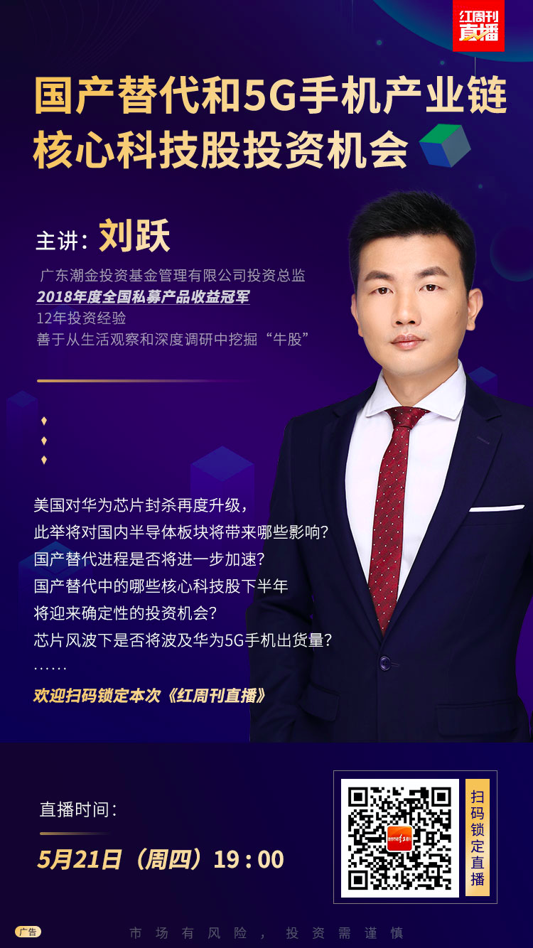 《证券市场周刊直播》首期邀请的嘉宾是,对科技股有着持续研究和追踪的广东潮金投资基金管理有限公司投资总监刘跃。其直播互动主题为《国产替代和5G手机产业链核心科技股投资机会》。本次直播将在5月21日(本周四)19点准时开始。