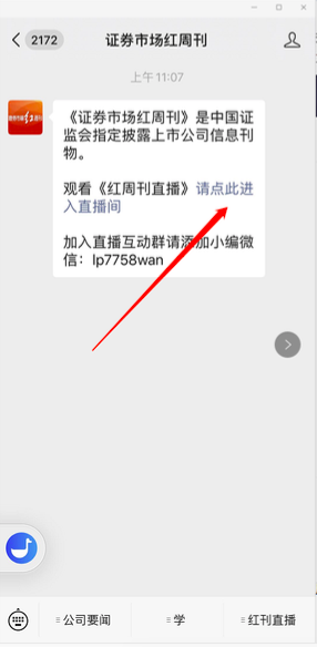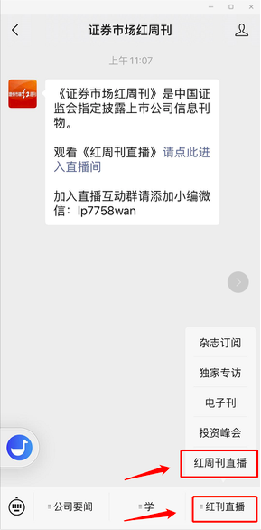 《证券市场周刊》老读者可以通过点击《证券市场周刊》公众号右下角的“《红刊直播》”栏目下的“《证券市场周刊直播》”子栏目,进入此次直播页面。