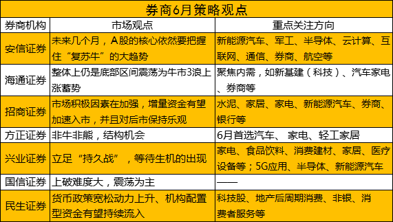 行业机会层面,内需消费和科技仍然是券商机构重点关注的方向。例如方正证券认为,行业配置上,继续关注偏内需的确定性机会,关注四条线索:一是汽车、家电、地产等地产后周期品种;二是传统投资稳增长领域,如旧改、铁路投资等;三是新基建调结构领域,如5G、数据中心、充电桩等;四是日常消费领域,如食品饮料、医药生物等。综合来看,6月首选汽车、家电、轻工家居。