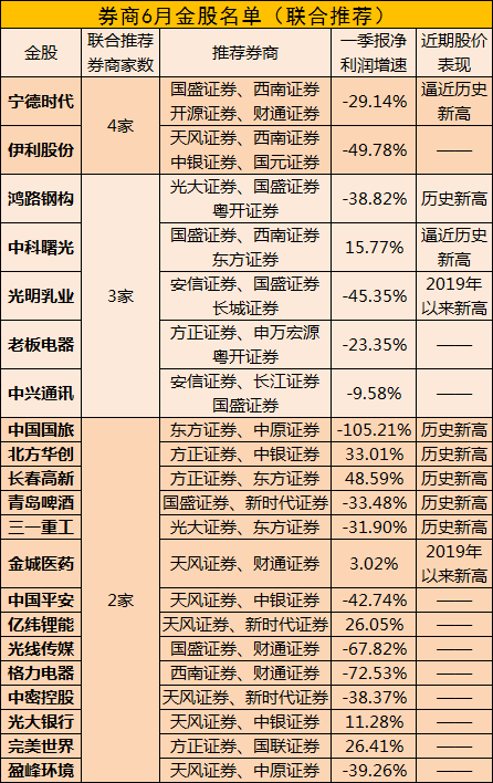 宁德时代、伊利股份同时被4家券商联合推荐,中科曙光、鸿路钢构、光明乳业、老板电器和中兴通讯同时被3家券商联合推荐。