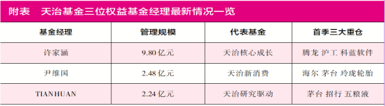 《证券市场周刊》作者发现,TIAN HUAN的投资风格和思路似乎更为贴近外资的思路,也就是对于核心资产类的白马蓝筹给予更多青睐。从一季报来看,除去天治转型升级对成长股有小范围的重仓布局外,其所管理的三只基金更多还是被核心资产类的标的所垄断,十大重仓中大部分股票都是一些投资者耳熟能详的上市公司。