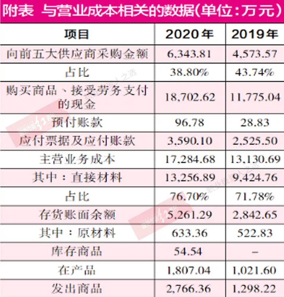 招股书显示,智立方2020年向前五大供应商采购了6343.81万元,占其采购总额的比重为38.80%,由此可知,其当年采购总额为1.64亿元。此外,据披露,其当年主营业务成本中耗用的直接材料金额为1.33亿元,占成本的比例为76.70%,直接材料相较采购金额少了3093.14万元(能源采购金额较低,忽略不计),这表明其本期并未将采购的原材料全部耗尽,故结转至存货后,将导致存货相关项目的增加。