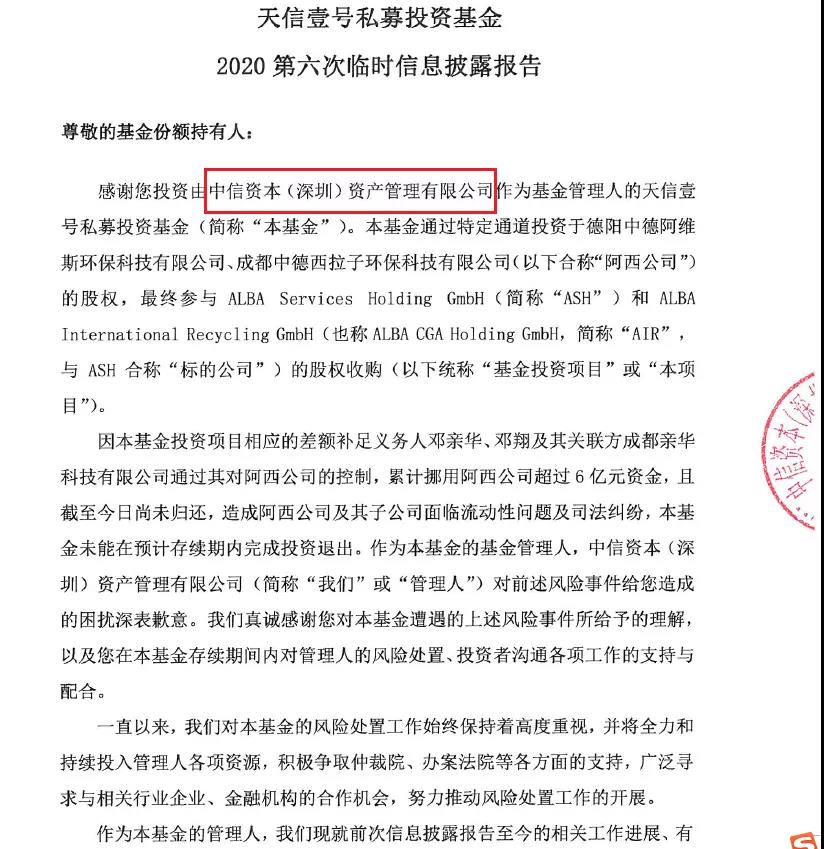图2 参投天翔环境并购欧绿保项目的某股权基金在逾期后的信披报告