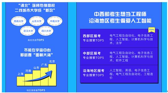 在专业选择上,电气工程及自动化、电子信息工程、人工智能等专业受到的关注最高。其中,电气工程及自动化、电子信息工程、人工智能、计算机科学与技术等专业均已成为中部,以及中西部地区考生搜索量前四。人工智能、英语、电子信息工程、电气工程及自动化、工程造价等专业,则是沿海地区考生的偏爱。