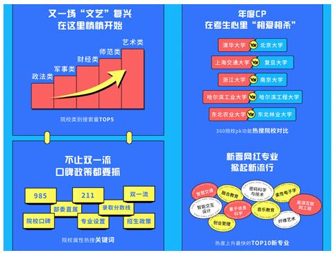 艺术类、师范类、财经类、军事类、政法类成为多省考生院校类别搜索量TOP5;985、211、双一流、部委直属等关键词排在搜索高频词前列。除此之外,智慧交通、融合教育、密码科学与技术、柔性电子学等新晋网红专业,也已受到众多考生关注,成为热度飙升最快的新专业TOP10。