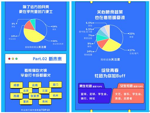 另外,据报告数据显示,考生在搜索专业相关问题时,薪水,就业单位性质,以及毕业去向,都是他们关心的重点。同时,他们对于大学的校内设置也十分关注,食堂、空调、暖气均占据他们关心的要点。