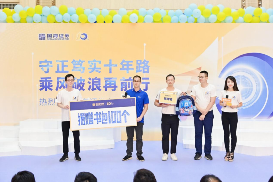 为倡导践行国海证券“感恩、爱心、责任”的公益理念,活动还举办了爱心捐赠仪式,为国海证券乡村振兴定点帮扶点来宾市兴宾区城厢镇平洞教学点、来宾市兴宾区三五镇上李小学捐赠书包100个。兰海航与国海证券驻帮扶村第一书记方毅代表双方进行捐赠交接。