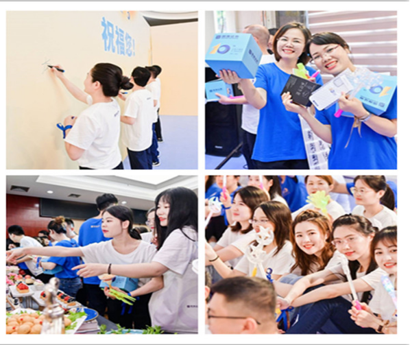 随后,在欢快的音乐声、欢呼声中,国海证券领导携手共同开启上市十周年庆祝蛋糕,大家共同分享庆祝蛋糕,并纷纷在祝福墙上写下美好祝福,共祝公司明天会更好。活动还设置了盲盒抽奖、美食品鉴等环节,大家在好看、好听、好玩、好吃的氛围中度过一个难忘的周末。