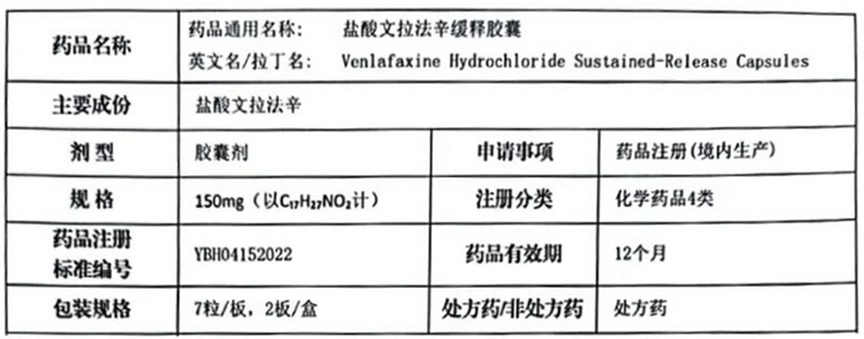 据悉,盐酸文拉法辛缓释胶囊用于治疗抑郁症(包括伴有焦虑的抑郁症)及广泛性焦虑障碍。文拉法辛是选择性5-羟色胺(简称:“5-HT”)和去甲肾上腺素(简称:“NE”)再摄取抑制剂(SNRIs)类抗抑郁药。