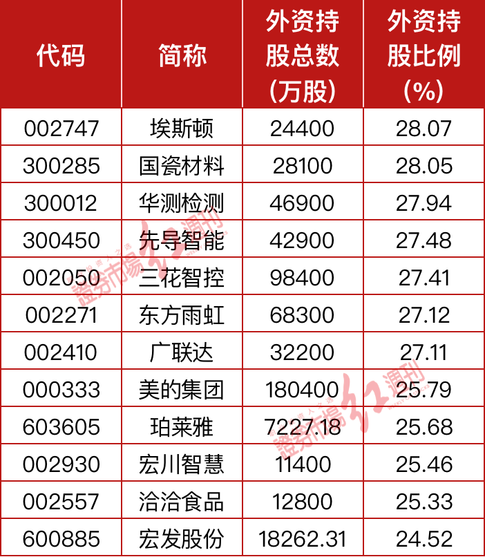 陆股通“白名单”和“特殊名单”的公司境遇不同,但都不是北上资金最喜欢的标的。相对而言,包括北上资金在内的外资最喜欢埃斯顿、国瓷材料、华测检测、先导智能和三花智控等12家公司(见表3),据Wind数据显示,目前这些公司的外资合计持股占比(总股本)均在24%以上。其中,埃斯顿和国瓷材料最受青睐,其外资持股占比均在28%以上。
