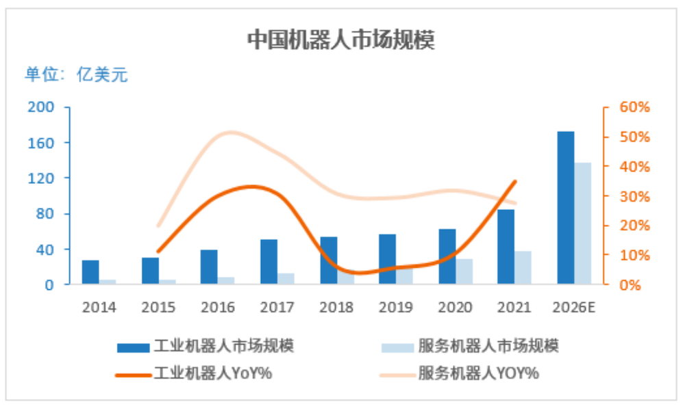 据统计,2021年中国工业机器人和服务机器人市场规模分别在80亿~90亿美元和35亿~40亿美元,全球占比均接近30%,未来随着技术的不断创新和下游需求的逐步释放,预计未来5年内CAGR分别可达15%和30%以上。