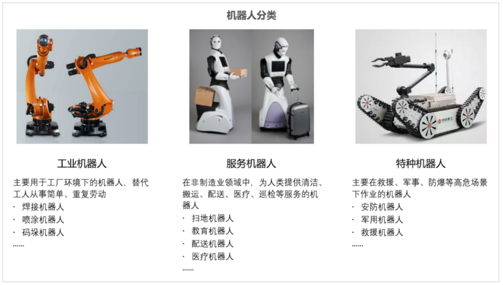 根据应用场景不同,机器人主要分为工业机器人、服务机器人和特种机器人三大类。