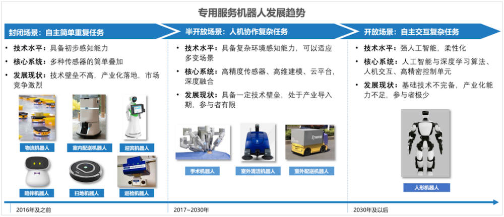而服务机器人受制于多样化的应用场景,作业环境相对开放、复杂,不可控因素较多,相对工业机器人发展较慢,当前仅扫地机器人、教育机器人等家用服务机器人实现了大规模的产业化应用,而商用清洁机器人、配送机器人、医疗机器人等专用服务机器人尚处于产业化导入初期,人形机器人更是处于技术研发阶段。