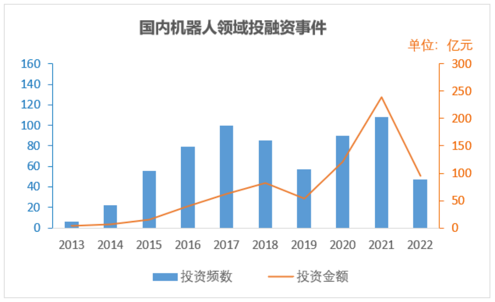 在服务机器人领域,其产业化发展主要由VC/PE机构推动,据统计,2013年~2022年上半年国内专用服务机器人领域累计投资金额超700亿元,其中自2020年起相关投融资呈现爆发式增长,并重点集中在A/B轮。