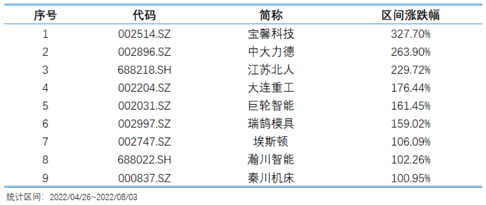 个股层面,自4月底以来,绝大部分机器人相关上市公司股价实现上涨,其中涨幅超过50%和100%个股分别达31只和9只,多涉及工业机器人价值量较高的动力系统及系统集成环节。