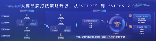 基于认知升级,张一鹏宣布升级品牌经营方法论STEPS 2.0。相较于STEPS1.0,STEPS2.0更强调“品牌自播”与“达人分销”结合,“公域流量加持”与“私域经营复购”结合,以及重视货维度选品策略。与此同时,再整体匹配“人货场”精细化运营,即公私域精细化运营、提供极致性价比货品、拓展营销场景等。