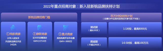 其中,新入驻新锐品牌囊括了2022年入驻快手且开店14日内的纯新商家、近30天自播滚动GMV小于10万的静默商家、在其他电商平台年自播GMV大于3000万的重点商家。并且,当新入驻新锐品牌自播GMV达到对应档位还可参与百万对投扶持计划。