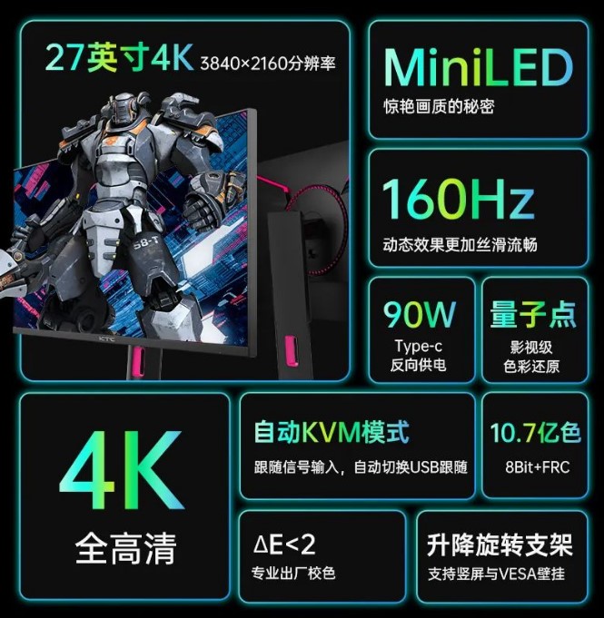 公司最新发布的KTC M27P20 PRO -MiniLED量子点平面显示器,27英寸,4K,3840x2160分辨率,比2K显示器大出40%更多。像素密度高达163PPI,200%放大率达成视网膜屏效果。