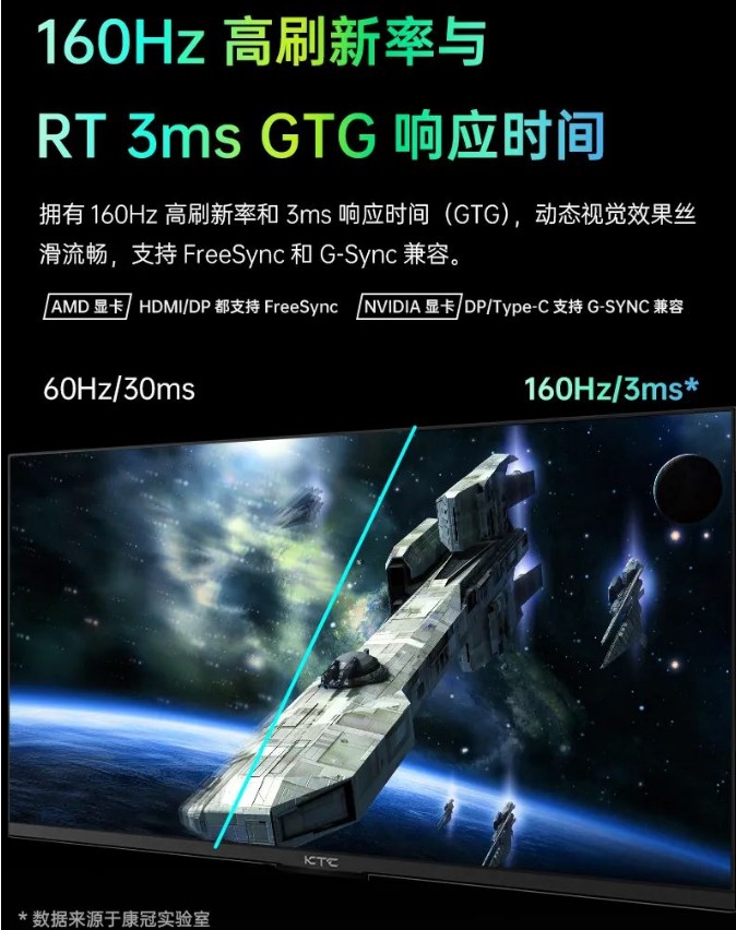 拥有160Hz高刷新率和3ms响应时间(GTG),动态视觉效果丝滑流畅,支持FreeSync和G-Sync兼容。