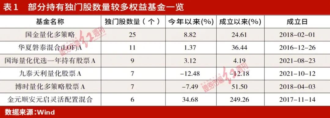 梳理基金全部持股,共221只股票仅被一只基金持有。剔除被动指数基金,持有最多独门股的主动量化策略基金有4只,它们分别是国金量化多策略、国海量化优选一年持有股票A、九泰天利量化股票A、博时量化多策略股票A;主动管理基金2只,它们分别是华夏磐泰混合A、金元顺安元启,且都大幅超越指数,表现出较好的风险调整后收益。