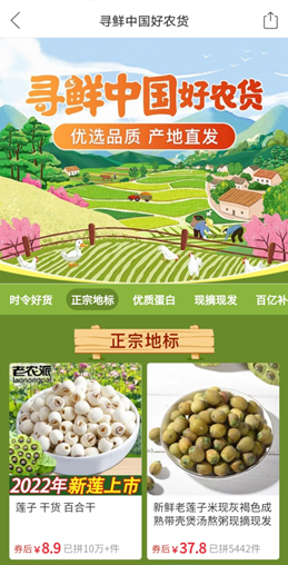 打开拼多多app,搜索“寻鲜中国”“多多好农货”“好农货”等关键词,即可直达专区,选购时令地标农货,品尝最新鲜、最实惠的好味道。