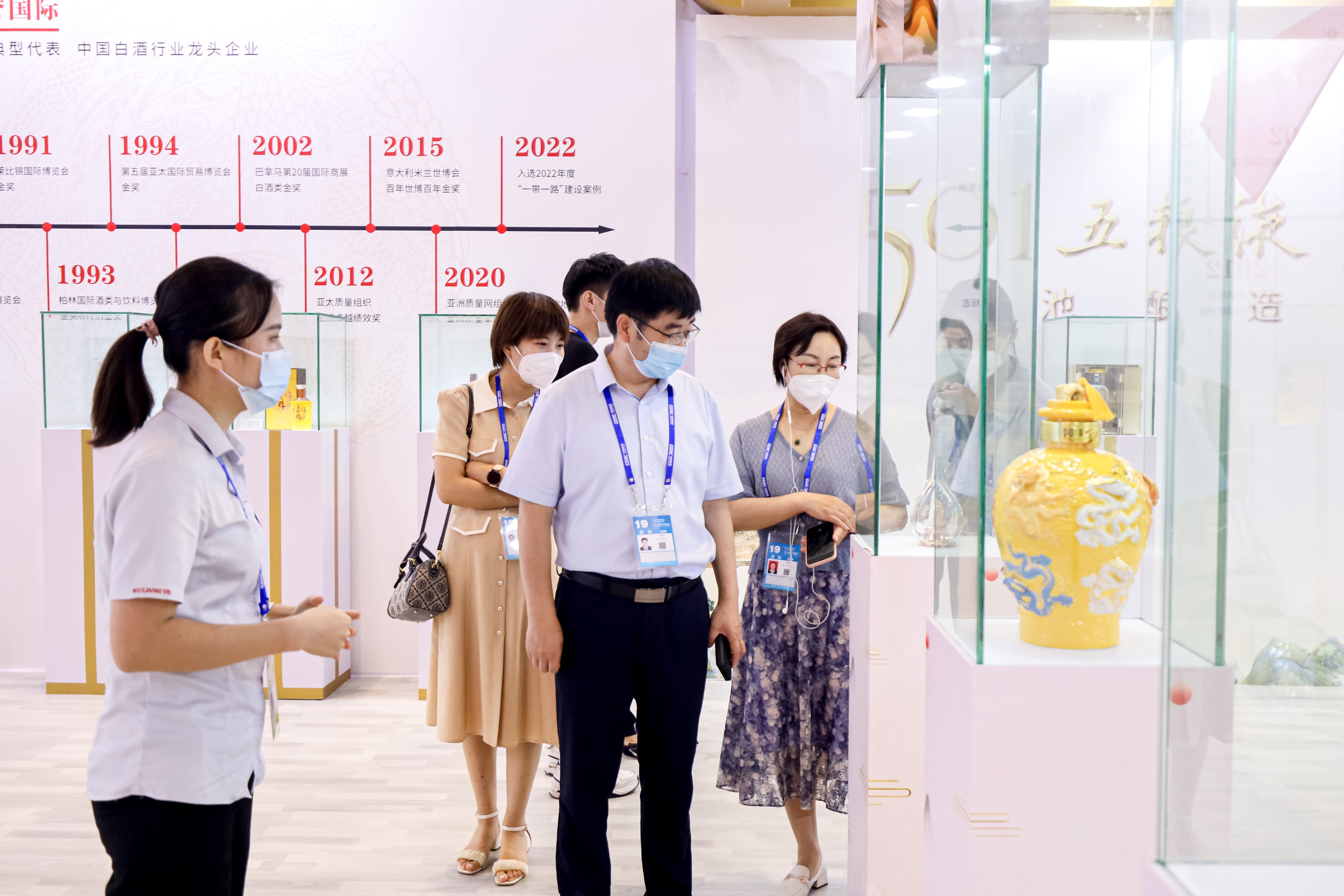 在精心设计的展厅内,集中展现了五粮液传承逾千年的古法酿造工艺、一代代五粮液人的匠心坚守和对品质的极致追求、650多年的国保明初古窖池、“种酿选陈调”美酒五字诀,呈现了“五位一体”五粮液的发展路径,生动立体地讲述了“大国浓香 和美五粮 中国酒王”的品牌理念及深厚底蕴,向世界展示民族品牌的文化自信与品牌自信,传递出五粮液全力打造世界一流企业的决心和信心。精心陈列的501五粮液、经典五粮液、第八代五粮液、五粮液·缘定晶生(天鹅款、戒指款)、五粮液·九龙坛等核心产品,吸引众多国内外客商驻足观赏、品鉴体验。