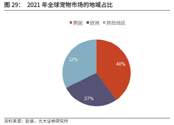 海外市场是宠企的主战地,究其原因主要在于国外市场发展相对更成熟,据光大证券研报显示,2021年美国宠物行业占据全球40%的市场份额,其次为欧洲,占据全球32%的市场份额,前述两大区域已然占据了全球7成以上的市场份额。
