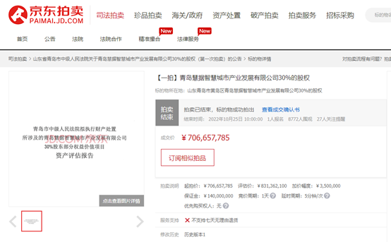 青岛慧据智慧城市产业发展有限公司30%的股权以7.07亿元成交,成为本届“标王”。北京四中院处置的北京市海淀区西三环北路“光耀东方”项目,评估价超10.7亿元,于11月11日以6.02亿元成交。北京市朝阳区景林路的一处房产,在近万人的围观下,经过55次竞价后,以1.58亿成交,成为京东11.11期间成交额最高的单体住宅项目。许昌晨鸣纸业股份有限公司名下机器设备一宗,最终以2.6亿元成功拍出,溢价1.6亿元,溢价率达160%。