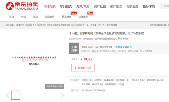 实在的价格充分激发了竞买人对资产处置标的的热情。某自然人持有的北京中金华创投资管理有限公司10%的股权,以1元价格起拍,共有59人报名,经过3202次竞价,最终以3.09万元成交,此次拍卖也创造了京东拍卖11.11期间竞拍次数最多的纪录。