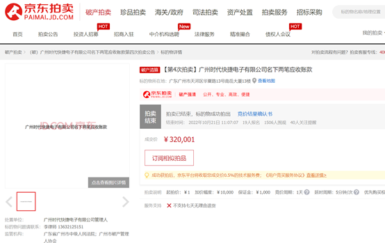 低起拍价对消费者的吸引力十足,在浓厚的竞价氛围中,创造了超高溢价率。1元起拍的广州时代快捷电子有限公司名下两笔应收账款,于10月21日以320001元成交,溢价倍数高达320000。