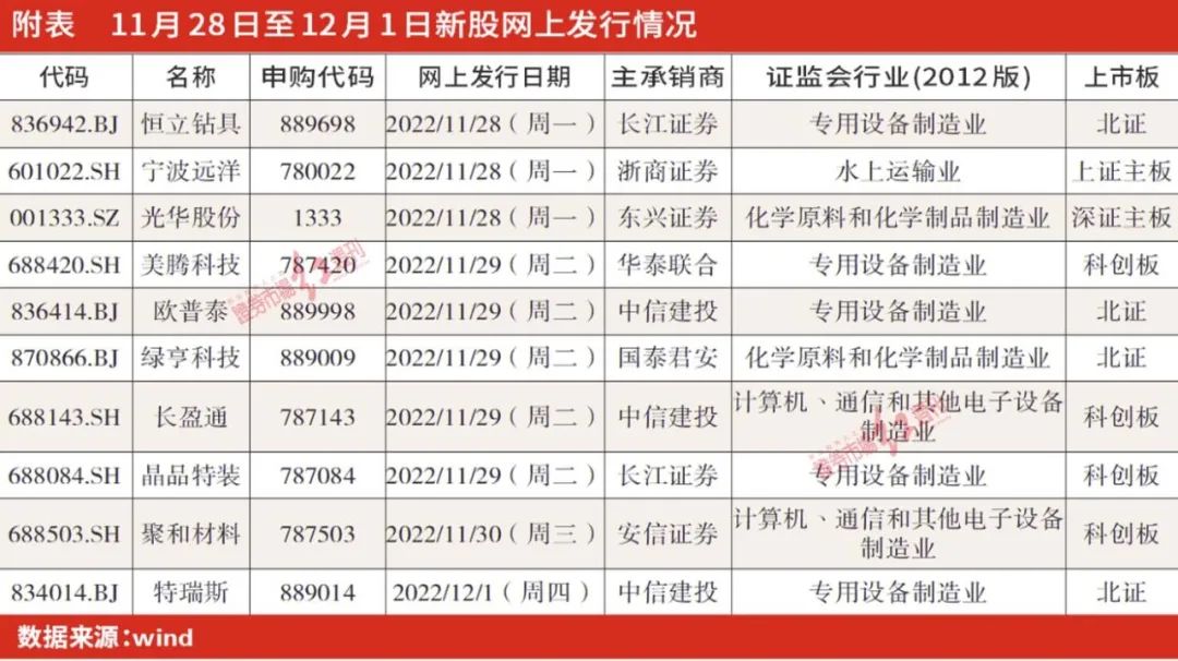 下周(11月28日至12月2日)将有10只新股开始网上申购,相较本周多了两只。具体来看,下周即将申购的新股主要集中在科创板和北证,两个板块将各迎来4只新股,成为下周“打新”的主阵地,此外,上证、深证主板分别有1只新股,而创业板下周则没有新股申购。