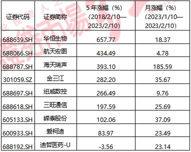 证券市场周刊 通过东财choice数据整理统计得出,在上市1年以上的公司中,本周股价创历史新高的共有9只,其中,当月(2022/1/10—2023/2/10)股价涨幅在20%以上的共有6只。同期申万的31个一级行业指数中,有27个实现上涨,居前的计算机、电子行业涨幅分别为13.75%和10.39%。