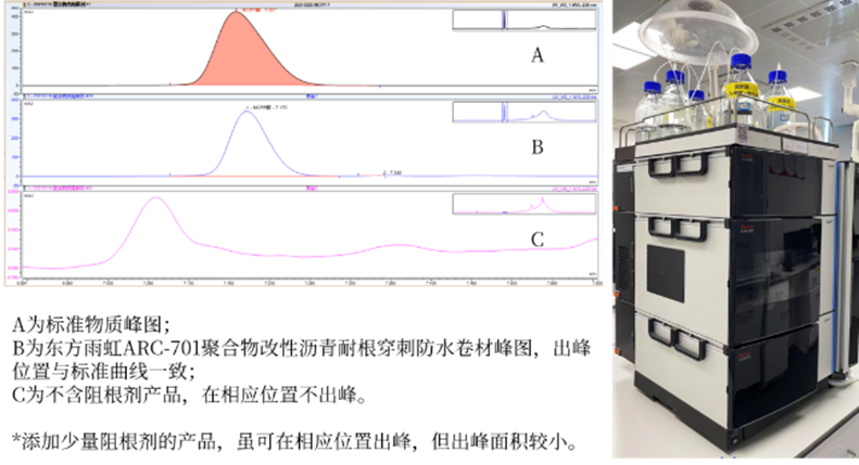 根据阻根剂厂商德国朗盛提供的欧洲耐根穿刺认证实验的添加比例建议,东方雨虹制定出严格的阻根剂添加标准。其中ARC-701聚合物改性沥青耐根穿刺防水卷材的阻根剂添加量为7‰。如上图所示,根据色谱仪检测数据可知,ARC-701聚合物改性沥青耐根穿刺防水卷材峰图与标准物质峰图保持一致,具备化学阻根性能。