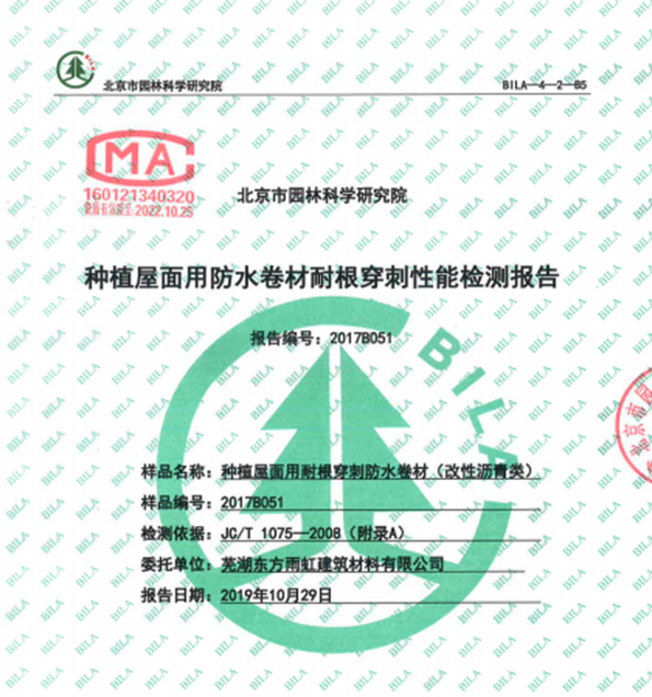 自2010年通过北京市园林绿化科学研究院阻根检测以来,东方雨虹ARC-701聚合物改性沥青耐根穿刺防水卷材已连续十二年通过耐根穿刺性能检测。如图所示,试验箱内植物生长正常,未出现根穿入现象。