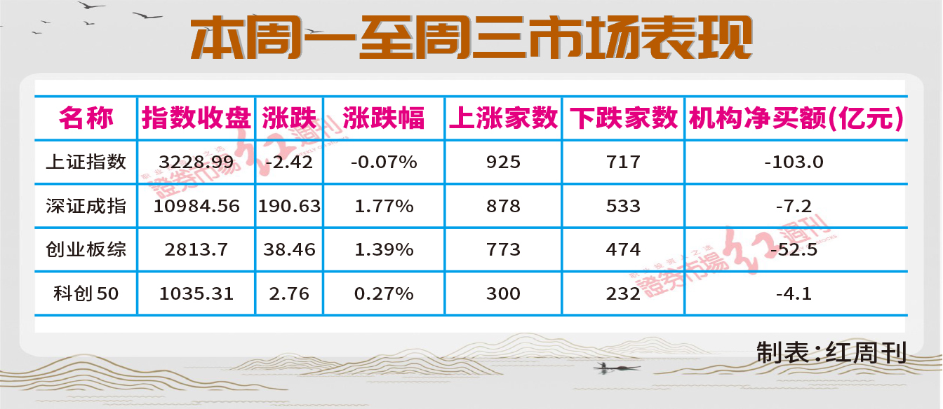 本周前三天沪指围绕3230点上下不足40点的区间内横盘震荡,周一沪指低开6点,早盘短暂下探3210点后回升,午后小幅冲高3239点,受阻回至前收附近,收于3228点,微跌2点,K线长上下影小阳。周二低开5点,下探3215点后再次回升至3230点附近,尾盘略有冲高,收于3233点,微涨4点,再收小阳线。周三高开5点,早盘冲高3249点后,再次受阻回至3230点附近,午后再次尝试冲高3044点后转弱下行,收于3228点,微跌4点,收长上影小阴线。另外三个市场指数略强于沪指,深成指三天涨幅1.77%,创业板指涨幅1.39%,科创板50指涨幅0.27%。