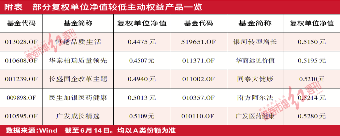 Wind统计表明,在目前复权单位净值倒数排行榜上,倒数前30名的产品复权单位净值基本都低于0.50元(仅一只除外),不过其中大部分是被动指数型产品,主动权益类的基金仅包括华泰柏瑞质量领先、恒越品质生活、长盛国企改革主题等8只。由此《证券市场周刊》分别选取成立时间较长的老基金和近期成立的新基金对比分析。