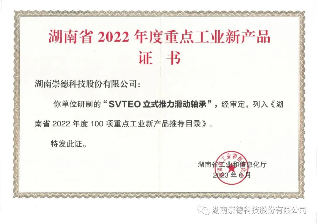 近期,《湖南省2022年度100项重点工业新产品推荐目录》发布,我司自主研发的拥有知识产权的SVTE0立式推力滑动轴承名列其中。